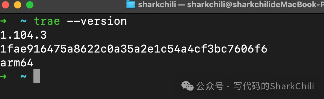 以笔者的笔记本为例,输出结果如下,由此可知笔者trae Command安装是正确的,后续我们就可以直接通过trae命令唤起Trae IDE: