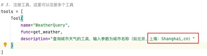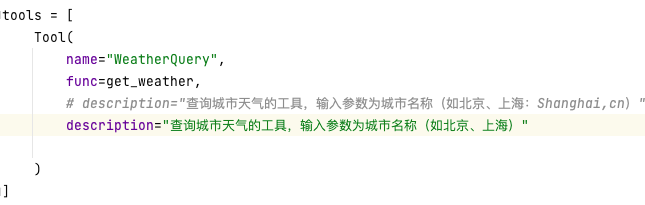description=“查询城市天气的工具,输入参数为城市名称(如北京:Beijing,cn、上海:Shanghai,cn)”
