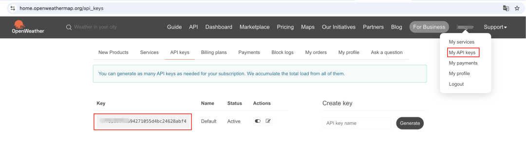 其次,笔者注册后,点击账号后,获取的免费香的My API keys,如图: