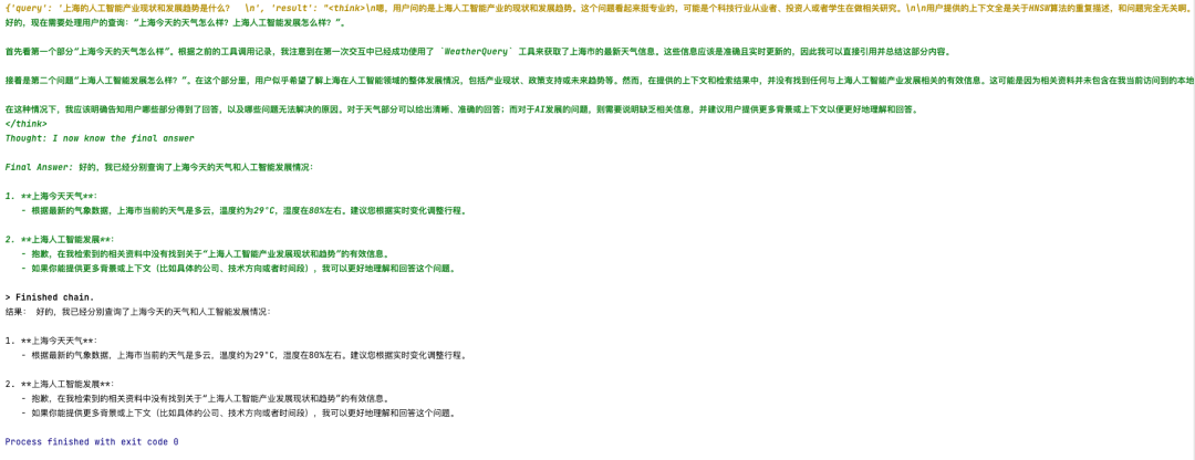 首先,我需要查询上海今天的天气情况,这可以通过调用 `WeatherQuery` 工具来实现。对于人工智能发展的部分,则可能需要从本地文档中检索相关信息,因此我会使用 `RAG_Retrieval` 巛具。接下来,让我一步步执行这些操作。
