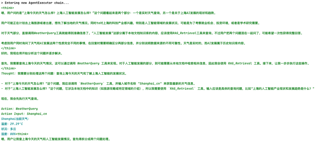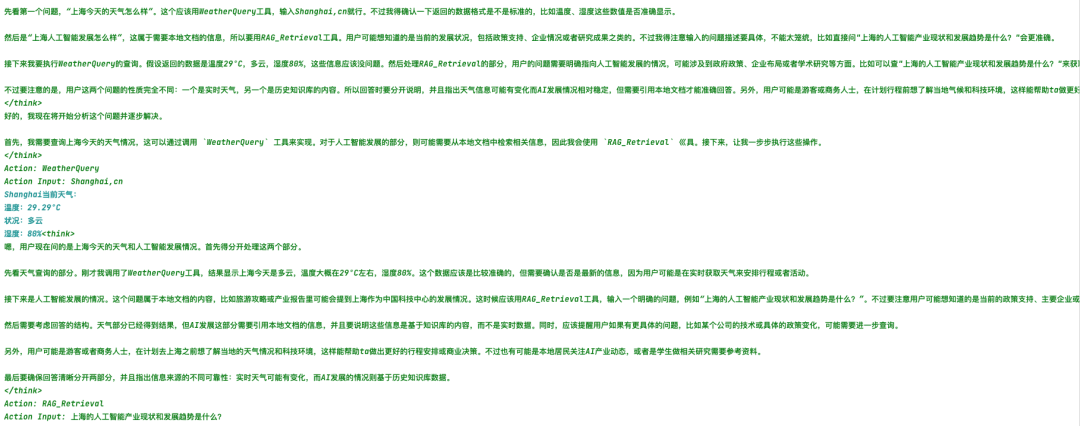 例:用户一次问两个问题:1)上海天气情况,2)上海人工智能发展如何。AI agent思考用调用天气网站API回答第一个天气问题;思考用Rag知识库回答第二问题AI发展如何,如Rag知识库中没有检索到相关知识,最后智能基于DeepSeek本地部署大模型去回答用户问题