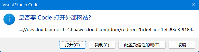 此时CodeArts Doer代码智能体还不能直接使用,需要进行登录,点击华为账号登录,弹出窗口提示:是否打开外部网站,点打开。