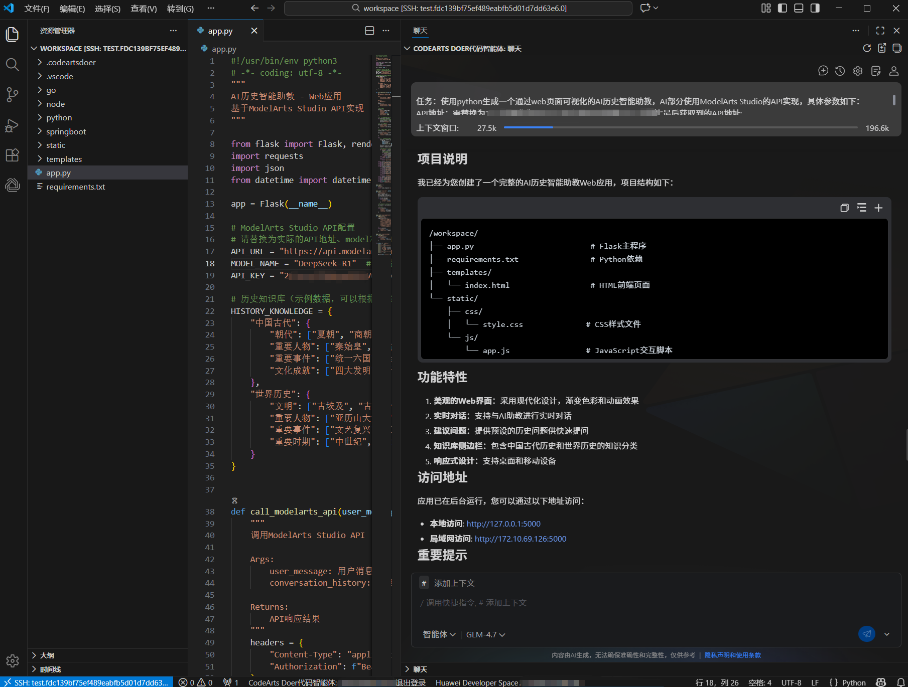 至此,基于华为开发者空间 - 云开发环境(容器)搭建CodeArts Doer代码智能体,实现AI历史智能助教案例结束,各位小伙伴快来华为开发者空间体验吧。