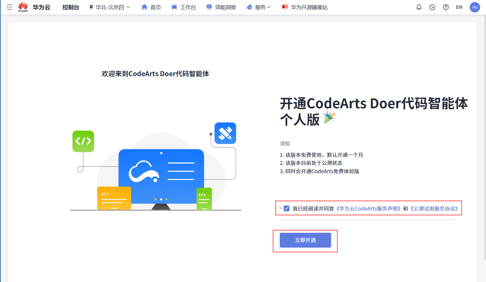 注:若为首次使用CodeArts Doer代码智能体,会进入开通页面。需要勾选**“我已阅读并同意”后,单击“立即开通”**,等待套餐开通完成。