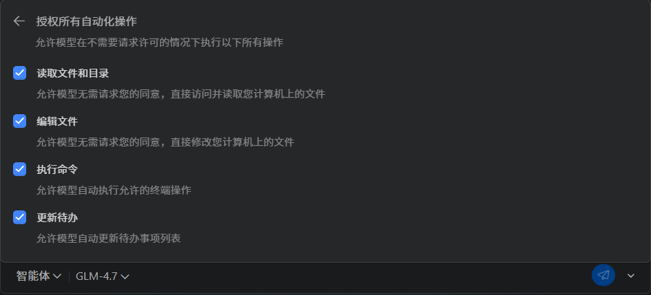 进入授权所有自动化操作界面,分别勾选读取文件和目录、编辑文件、执行命令、更新代办。