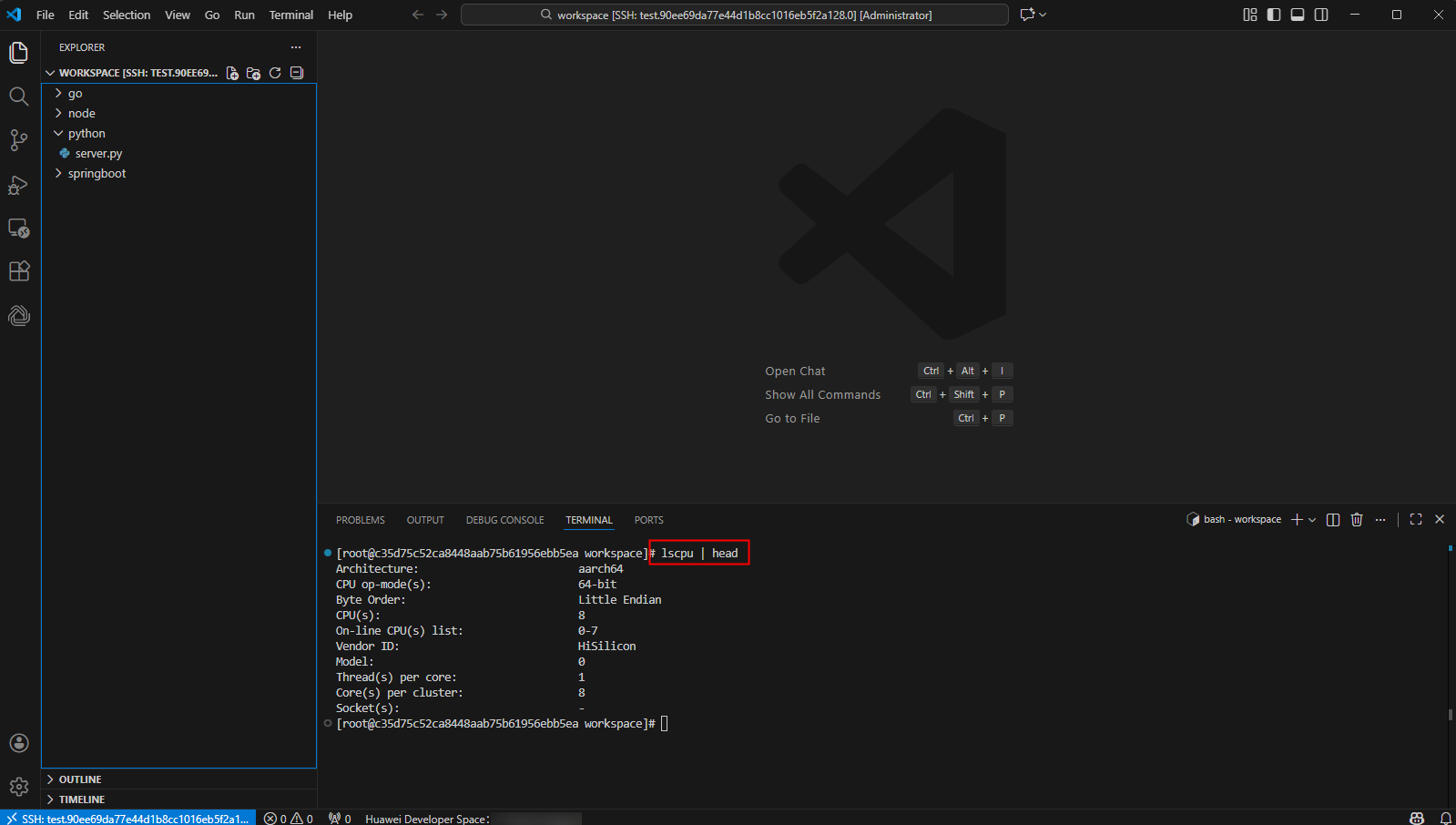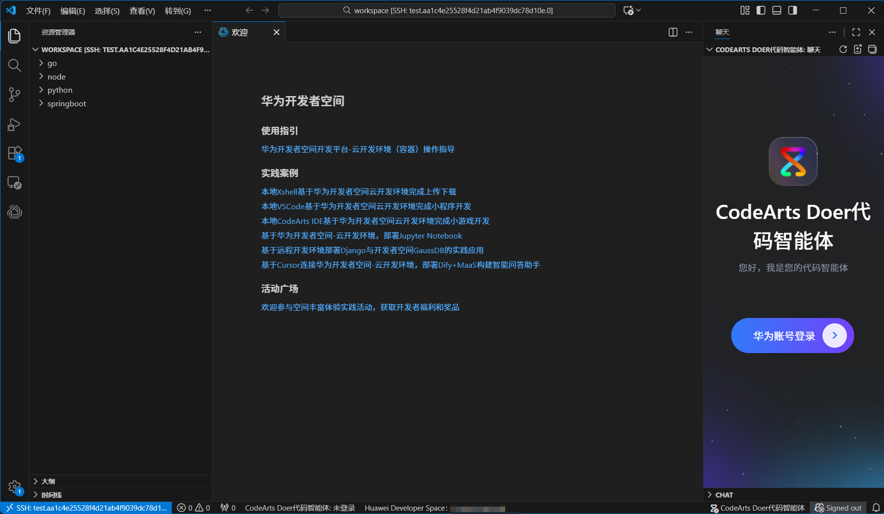 参考案例《华为开发者空间 - 云开发环境(容器)IDE插件远程连接操作指导》中的“二、云开发环境IDE插件远程连接操作指导”的内容,完成“1. 安装插件” ~ “4. 连接”章节步骤。