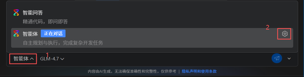 在CodeArts Doer代码智能体对话框下侧点Agent模式,在弹出的菜单最后侧点设置按钮。