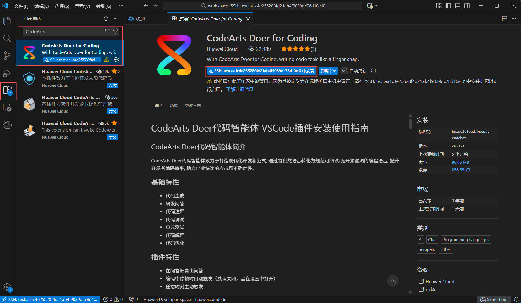 在VS Code插件市场搜索并找到CodeArts Doer for Coding插件,点击在 SSH:tesxxxxx 中安装。