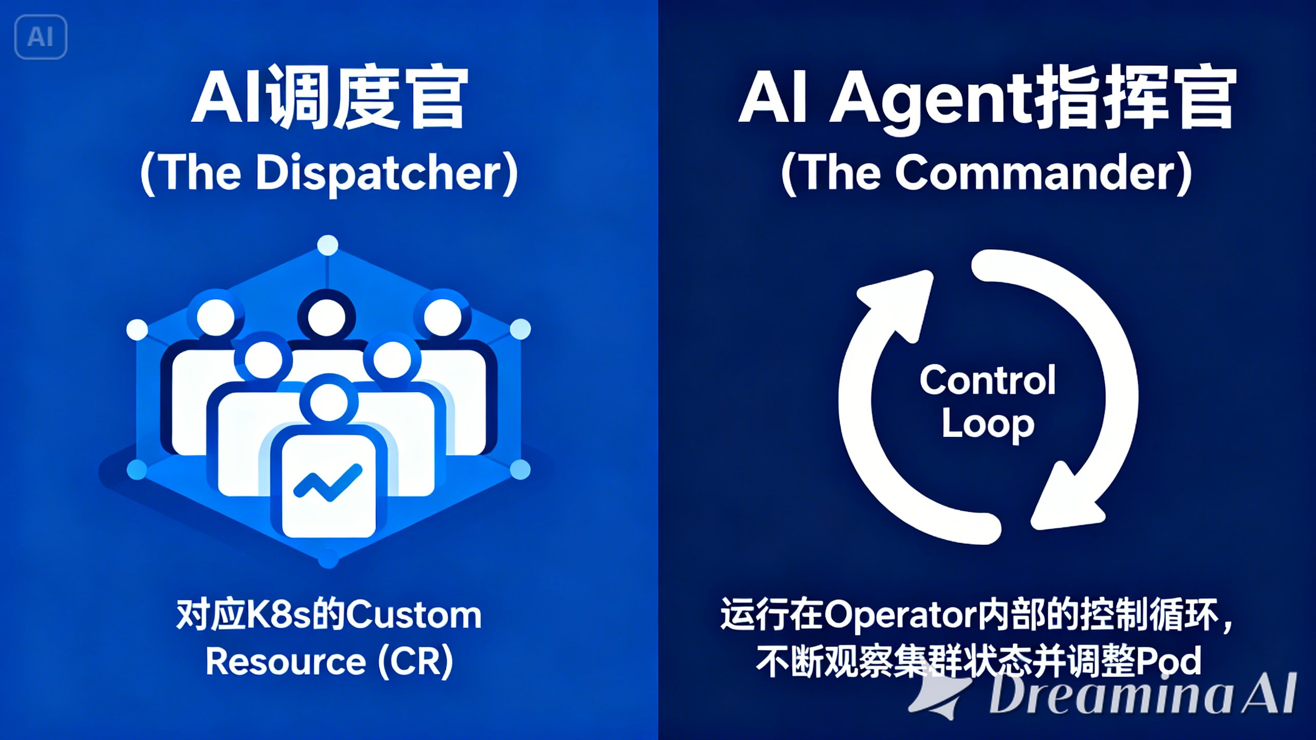 Controller (Reconcile Loop): AI Agent 指挥官 的逻辑实体,负责调和状态。