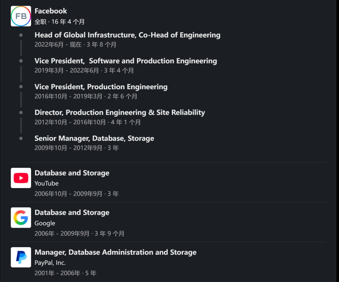 而在Meta的这十几年,他一路从数据库高级经理干到全球基础设施负责人,工程及管理经验都很丰富。