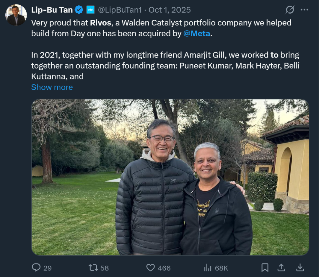 后来英特尔CEO、Rivos董事长陈立武也确认了这一收购消息: