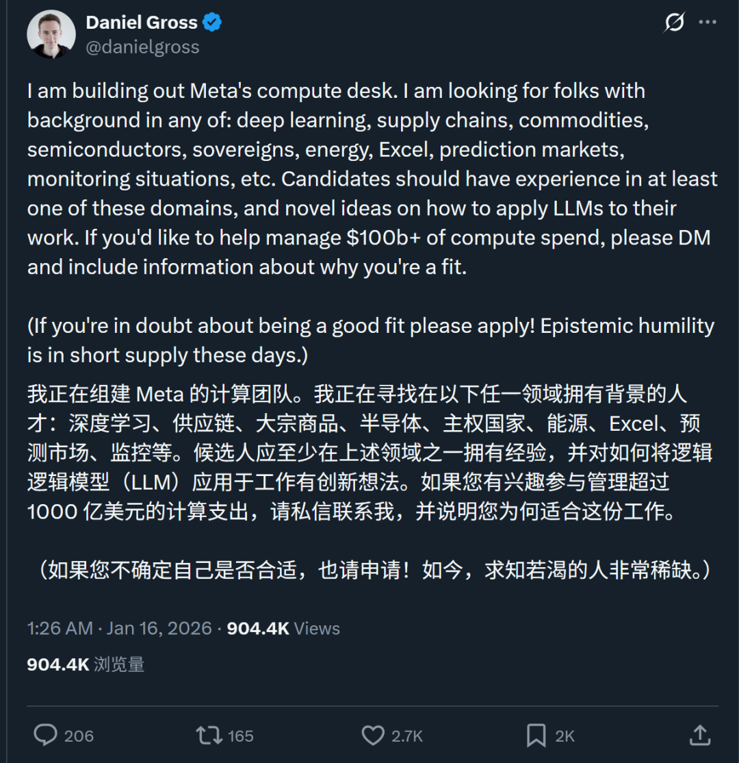 此次负责领导“Meta Compute”项目后,他将专注于构建和优化算力基础设施的长期战略体系,具体包括产能战略规划、供应链生态建设、行业趋势研判、商业模式设计等内容。