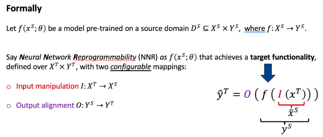 。神经网络可重编程性使这个固定模型(参数不再改变)能够通过两个可配置的变换在完全不同的目标域(target domain)实现由该域输入 / 输出空间