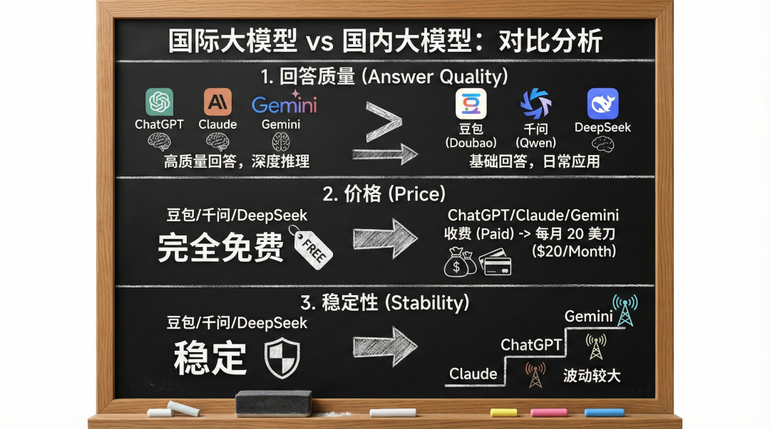 AI 模型更新速度极快(按周计算)。如果是工作重度使用,建议**“DeepSeek (逻辑) + Kimi (阅读)”**组合使用,完全免费且效率翻倍;如果有条件,ChatGPT/Gemini 依然是探索 AI 边界的最佳窗口。