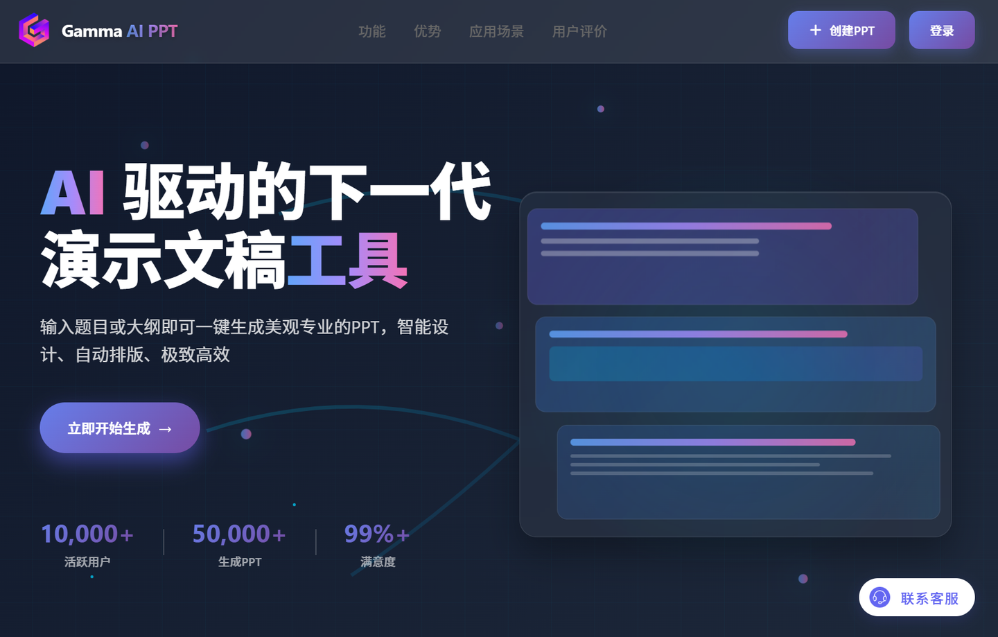 Gamma是一款主打极简设计风格的在线PPT工具,与传统PPT软件的页面编辑逻辑不同,它采用模块化“块编辑”模式,制作过程像搭积木一样简单,生成的PPT自带现代感与高级感,适合互联网、咨询、创意等注重视觉调性的行业。这款工具的年终总结PPT模板以低饱和度配色、简洁排版为主,避免花哨动画,聚焦内容本身,非常适合内部会议总结、轻量汇报场景。我曾用Gamma为团队周度总结制作演示文稿,输入核心要点后选择“极简商务”类年终总结PPT模板,5分钟就生成了风格统一的初稿,页面留白充足、元素搭配协调,无需额外调整排版就能直接使用。