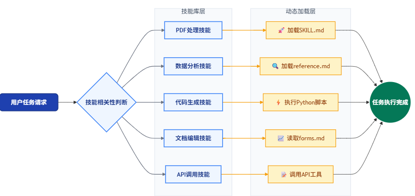 Skills的核心设计理念是渐进式披露机制。AI智能体在启动时只加载技能的元数据,只有在判断某个技能与当前任务相关时,才会完整加载技能内容。这种机制大幅降低了Token消耗。根据数据,通过渐进式披露,Token消耗从16,000降至500,节省高达96.9%。