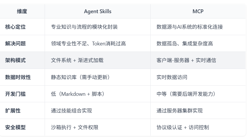 Skills 解决的是“如何专业化执行”的问题,关注领域知识和操作流程的封装。