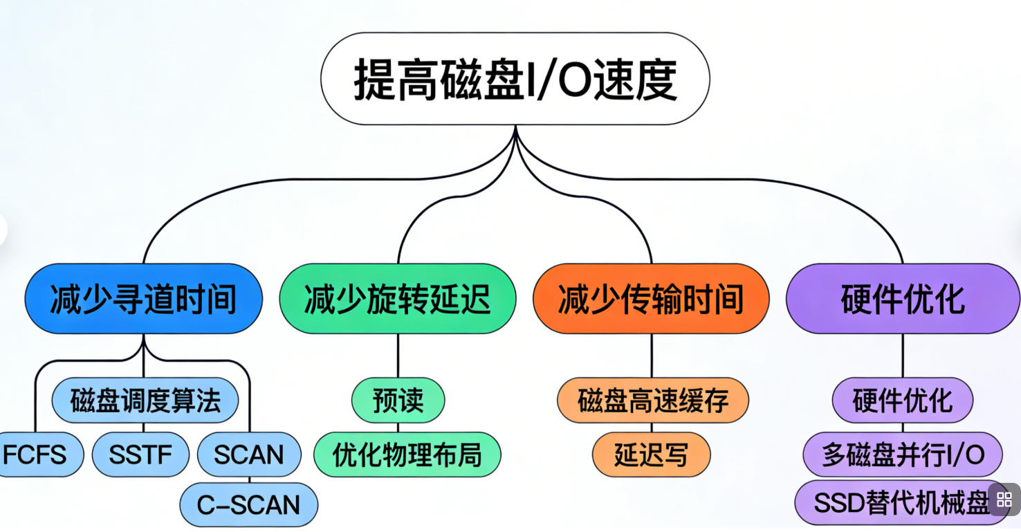 - 磁盘 I/O 优化的核心是减少寻道时间(调度算法)、利用缓存 / 预读,可靠性依赖 RAID 等容错技术;