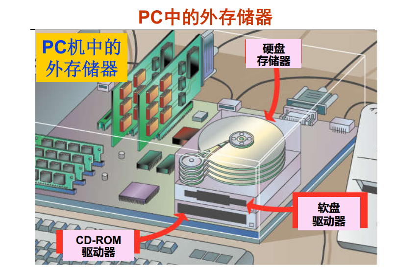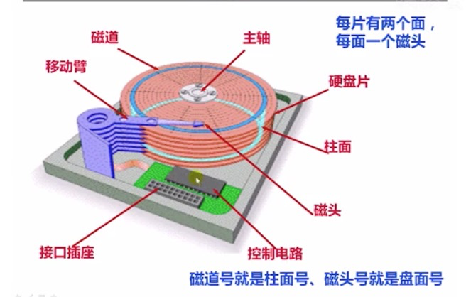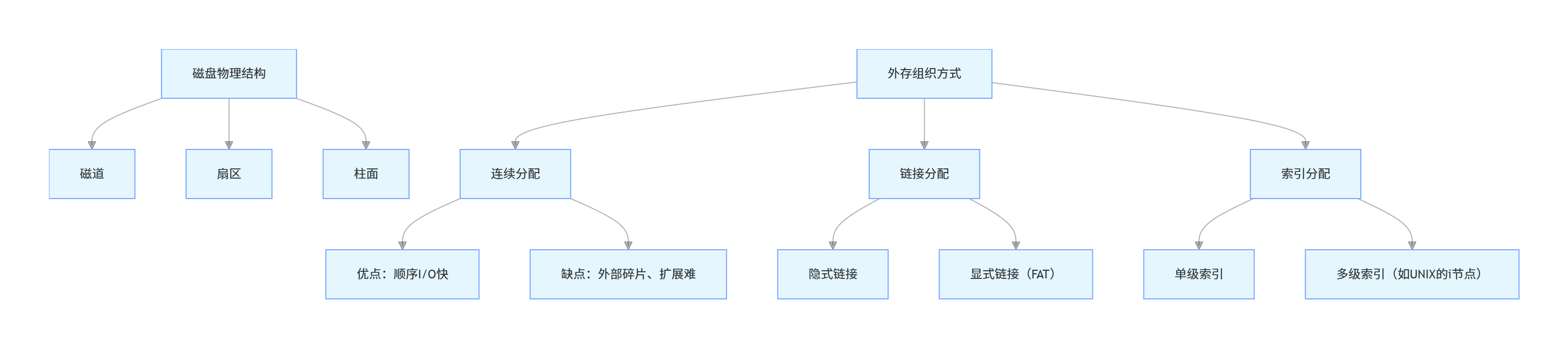 磁盘的物理结构:磁道(同心圆)→ 扇区(磁道分割的最小存储单元)→ 柱面(不同盘面的同号磁道);常见外存组织方式: