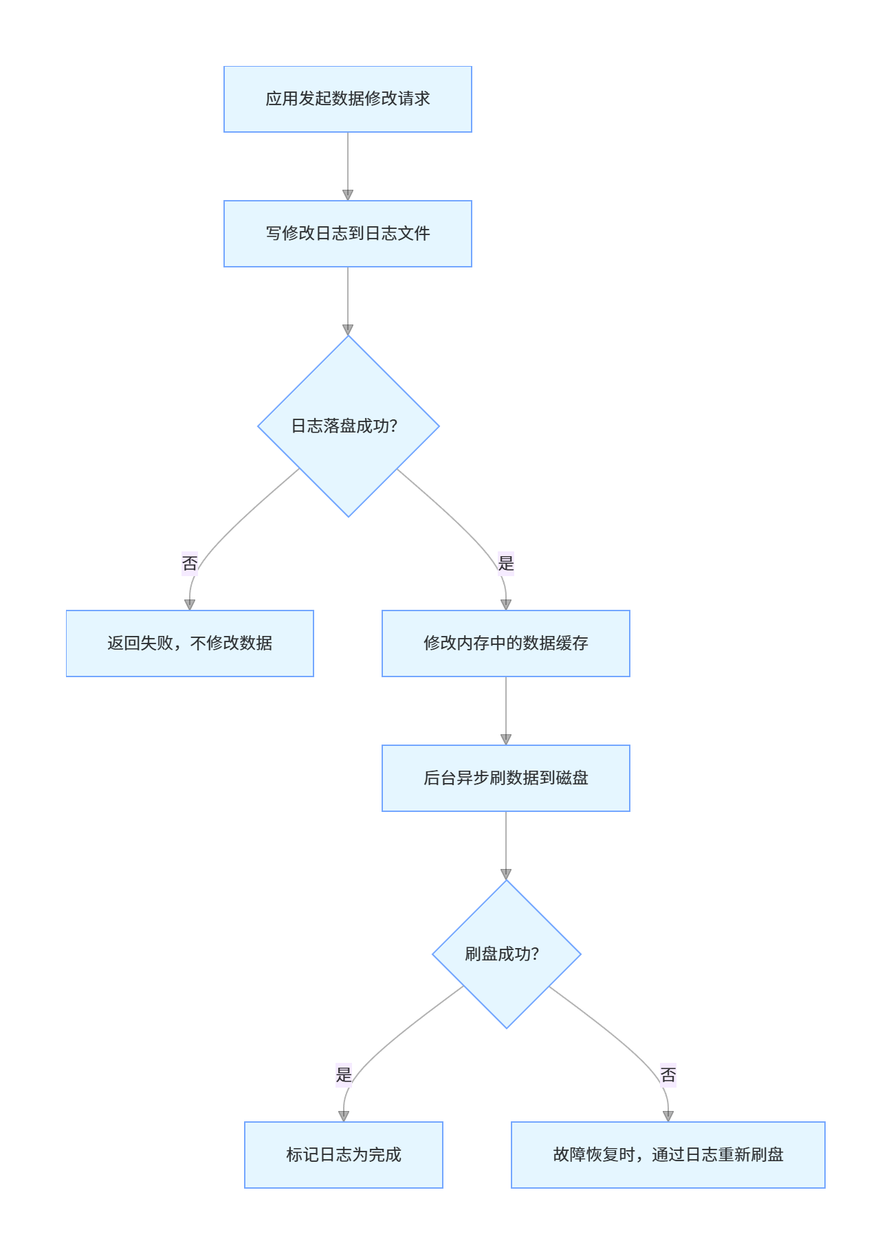 - WAL 核心流程:先写日志→日志落盘→修改内存数据→异步刷盘,保证故障时可通过日志恢复;