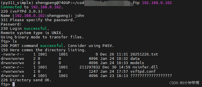 如上图所示,在linux的客户端登录成功,列出了当前ftp服务器根目录下的文件。