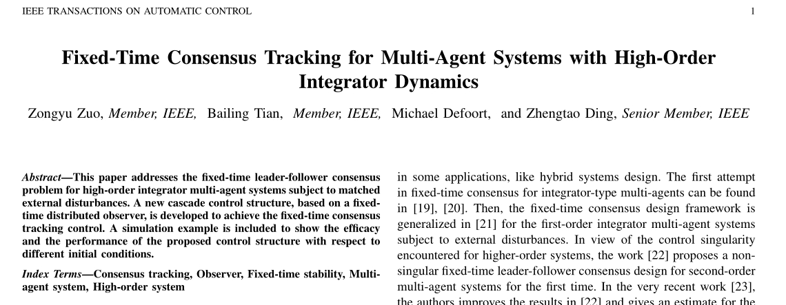 高阶积分器多智能体系统在诸如无人机编队、机器人协作等实际场景中广泛应用。但外部干扰常常破坏系统的一致性。我们的目标就是在这种干扰环境下,实现固定时间内,跟随者能准确跟踪领导者的状态,达到一致性。