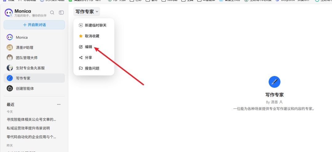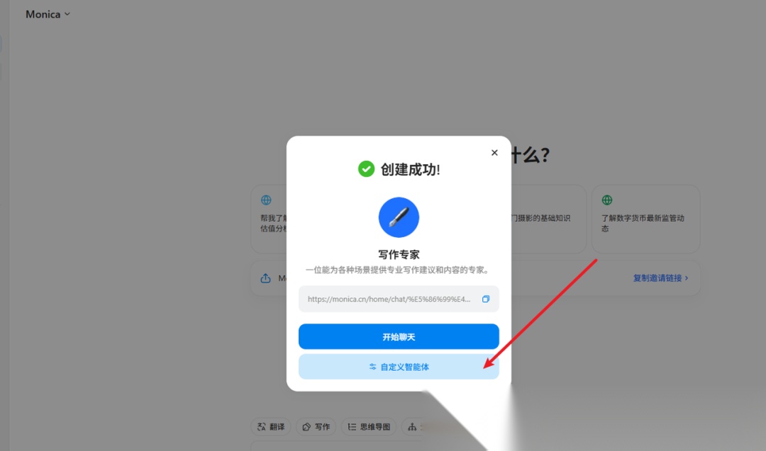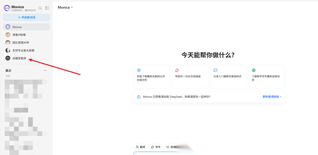 (1)打开 https://monica.cn/home,在左侧菜单栏找到并点击【创建智能体】。