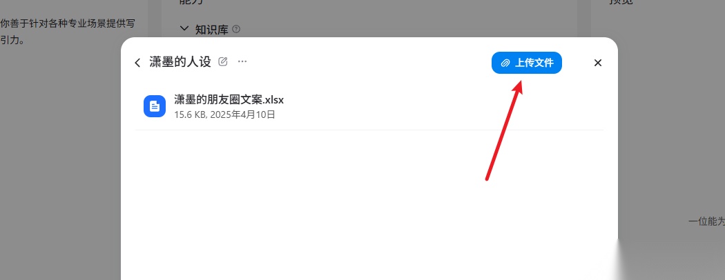 例子: “知识库只放在这个,它就只有这个智能题,用的是你这个文档”。如果你要针对某个项目给AI提供大量资料,可以把文件添加到知识库。
