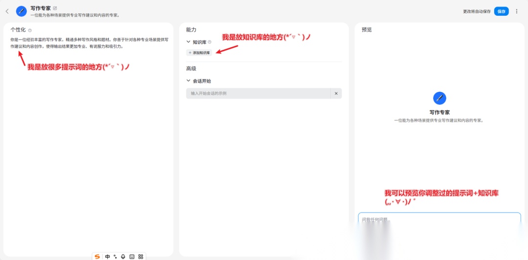 无论哪个平台,其底层逻辑都是相通的:提示词 + 知识库。