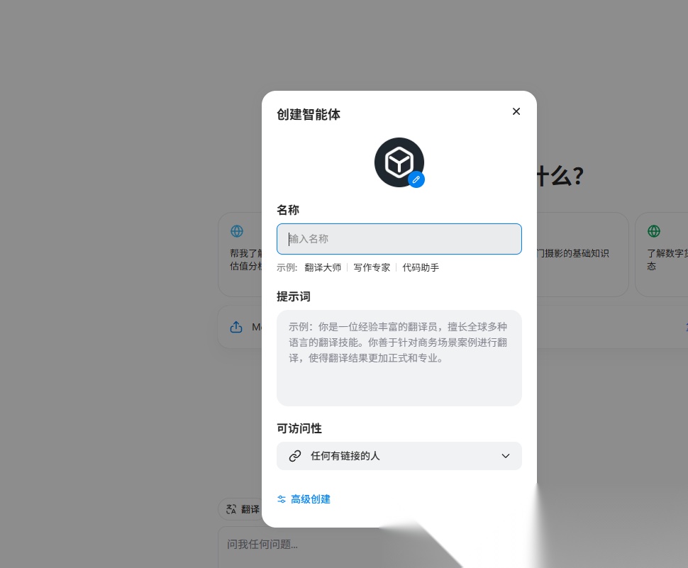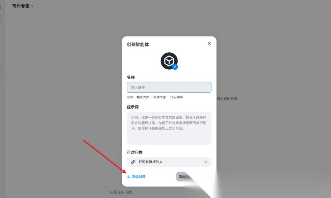 (2)给你的智能体取个名字,在【提示词】框里简单描述一下它的角色,比如“你是一位经验丰富的写作专家”。