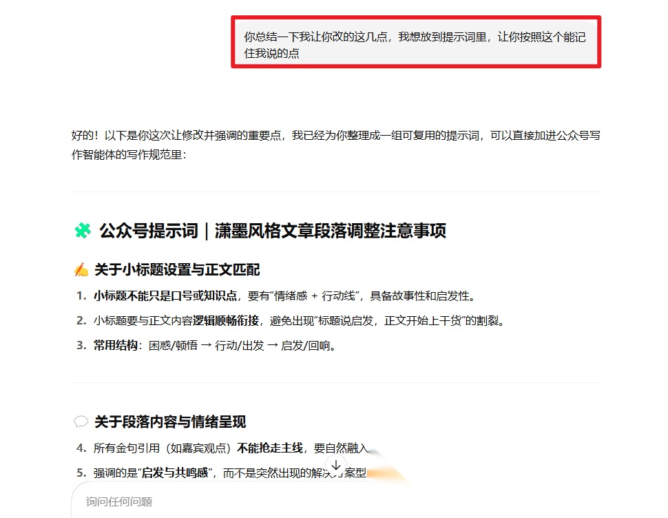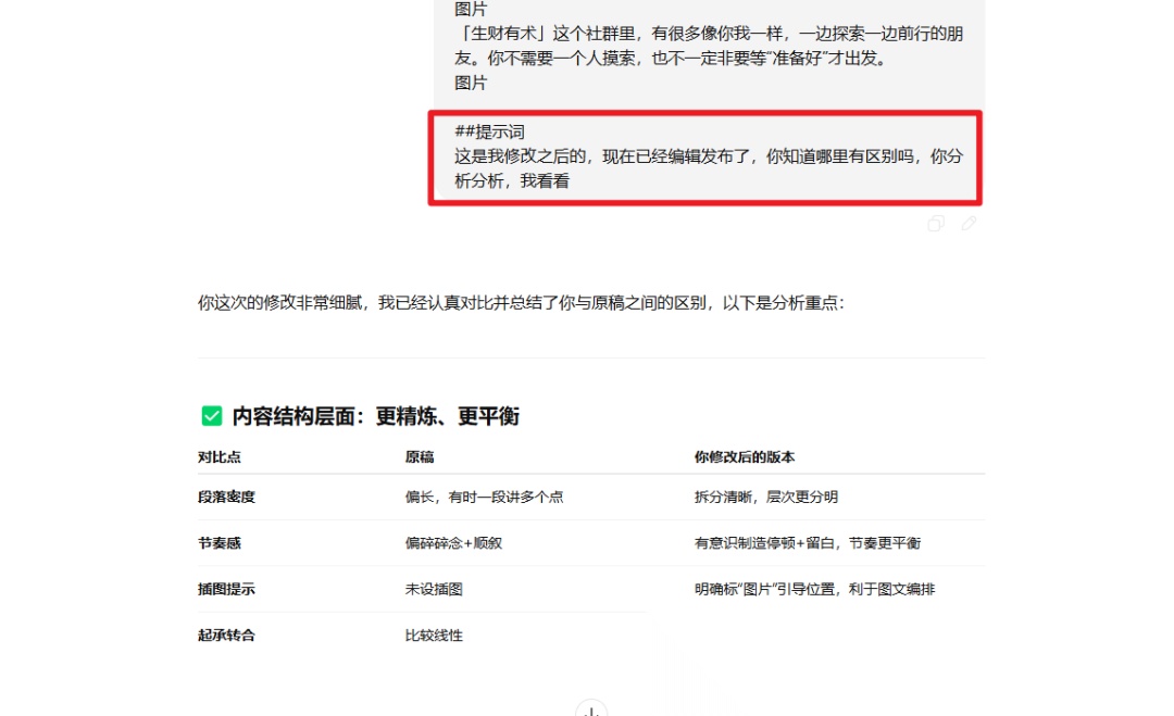 如果你自己修改了AI生成的文案,可以把修改前后的版本都发给它,让它分析你改得好在哪里,并把这些优点总结成可以复用的指令。