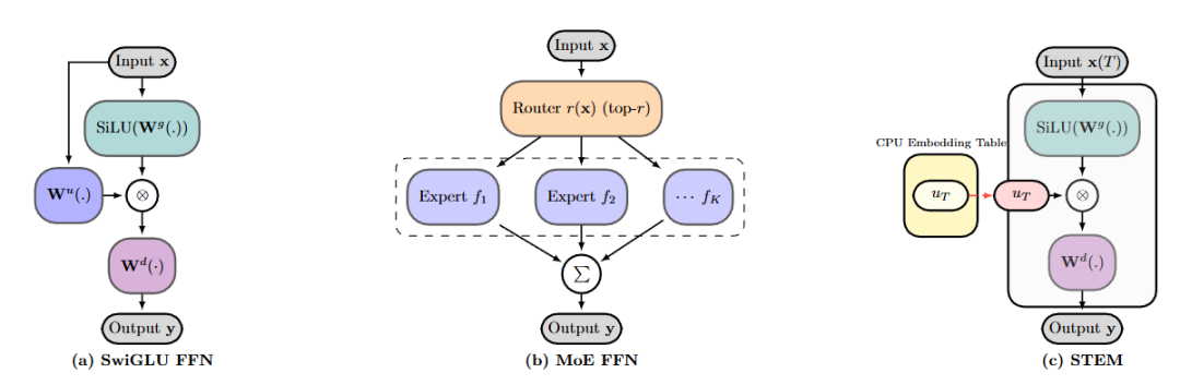 图注:左边是传统的 SwiGLU,中间是复杂的 MoE,右边是清爽的 STEM。注意红色箭头指向的部分,STEM 直接用查表取代了庞大的上投影矩阵,彻底抛弃了复杂的路由机制。