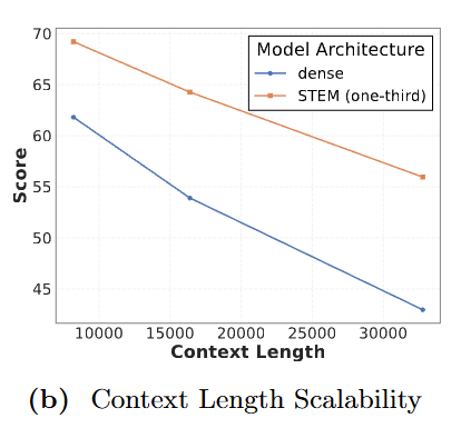 图注:在大海捞针测试中:随着上下文长度(X 轴)增加,STEM(橙色)与基线(蓝色)的差距越拉越大。这证实了 STEM 的「测试时容量扩展」特性在长文本场景下具有天然优势。