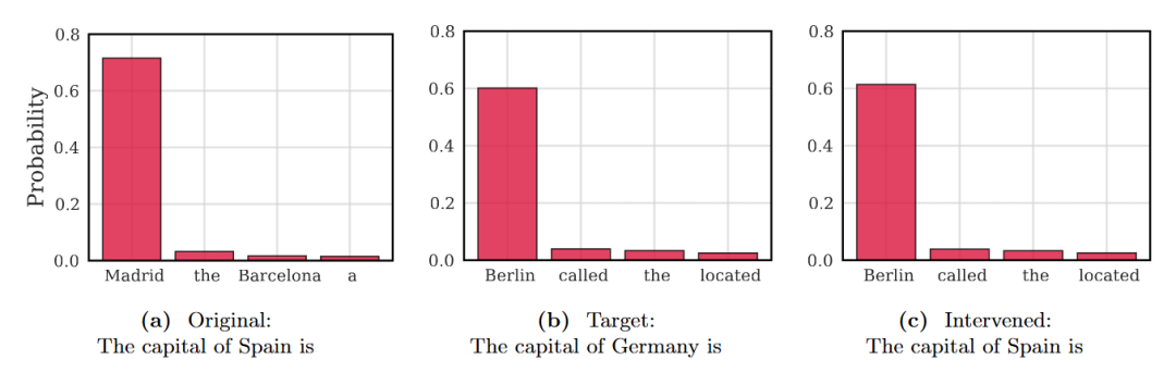 图注:仅仅替换了 Token 的 Embedding,在不改变输入文本的情况下,模型预测「马德里」的概率瞬间消失,转而高置信度地预测「柏林」。这是传统黑盒模型难以做到的。