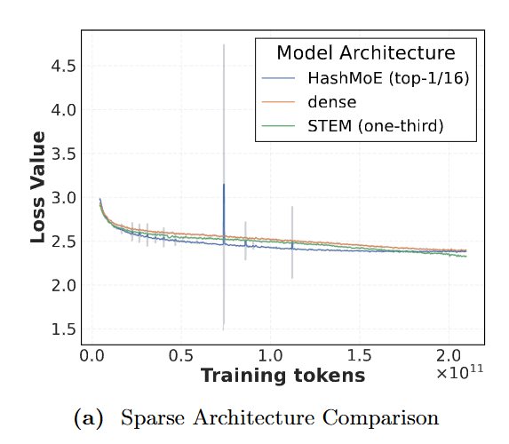 图注:MoE 虽好,但训练由于路由机制常常出现 Loss 尖峰(蓝色曲线)。而 STEM(绿色曲线)凭借其静态稀疏性,展现了如稠密模型般丝滑的训练稳定性。