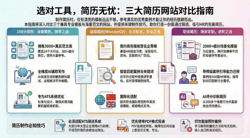 本文推荐了三款专业的简历制作网站,帮助求职者解决简历撰写难题。100分简历提供3000+真实案例和AI辅助功能;超级简历(WonderCV)以专业简洁风格著称,适合外企求职;职徒简历则专注于跨行业求职指导。文章对比了三者的特色功能,并解答了关于ATS系统、简历格式等常见问题,建议求职者参考案例但不要照抄,优先选择PDF格式投递简历。