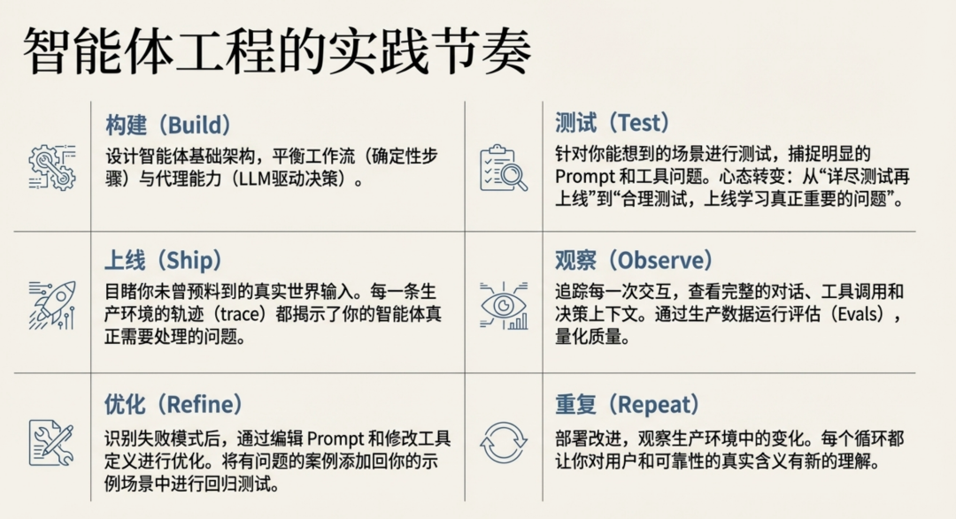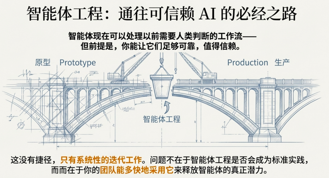 智能体工程本质上是一种思维模式的转变。它要求我们将生产环境视为**“主要老师”**,并强调通过快速、系统性的迭代来打磨一个原本不可靠的系统。
