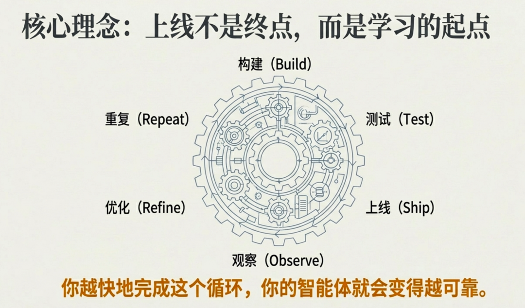 这里的关键思想是:上线(shipping)不是开发的终点,而是学习的真正起点。只有将智能体置于真实世界中,我们才能获得改进它所必需的深刻见解。因此,快速地完成这个迭代循环是提升智能体可靠性的关键。