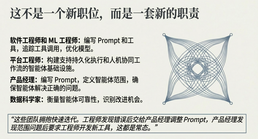 这些技能如何映射到你的团队中?智能体工程并非一个全新的职位,而是一套由现有团队成员共同承担的责任。在那些成功交付可靠智能体的组织中,我们通常看到以下分工: