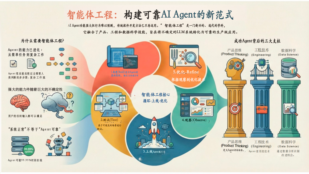 智能体工程:构建可靠AI系统的迭代方法 智能体工程是将非确定性大语言模型(LLM)系统优化为可靠生产系统的迭代过程,采用"构建-测试-上线-观察-改进"的循环模式。它融合产品思维、工程技能和数据科学三大支柱,与传统软件开发不同,将生产环境视为主要学习来源。随着LLM能力增强但伴随不可预测性,智能体工程成为解决"能用"与"好用"鸿沟的必要方
