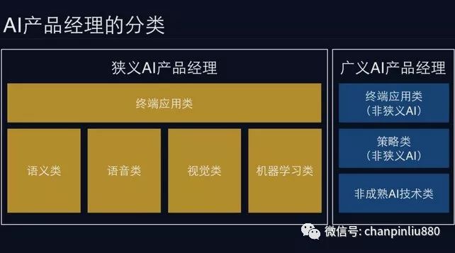 引用@hanniman的观点,AI产品经理可以从狭义和广义来分类: