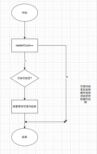 读写锁包含一个互斥锁.写锁必定要先获取该互斥锁.如果互斥锁已被协程A获取(或者