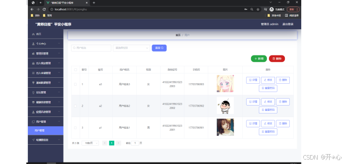 如图5.1显示的就是用户信息管理页面,此页面提供给管理员的功能有:用户信息的查询管理,可以删除用户信息、修改用户信息、新增用户信息,