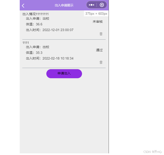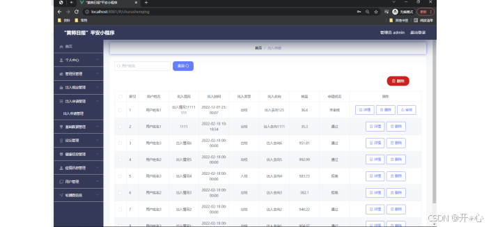 如图5.2显示的就是出入申请管理页面,此页面提供给管理员的功能有:查看已发布的出入申请数据,修改出入申请,出入申请作废,即可删除,还进行了对出入申请名称的模糊查询 出入申请信息的类型查询等等一些条件。