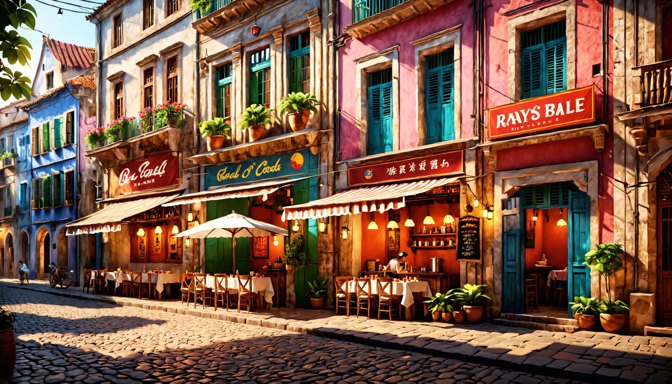 Relaxing, Charming Streetscape, Old Buildings, Vibrant Atmosphere, Human Activity, Colorful Posters, Street Food Aroma, Cool Breeze, Local Flavors, Unique Architecture, cinematic lighting, depth of field, high fidelity, texture details, ray traced shadows, global illumination, photorealistic, raw photo style, film grain