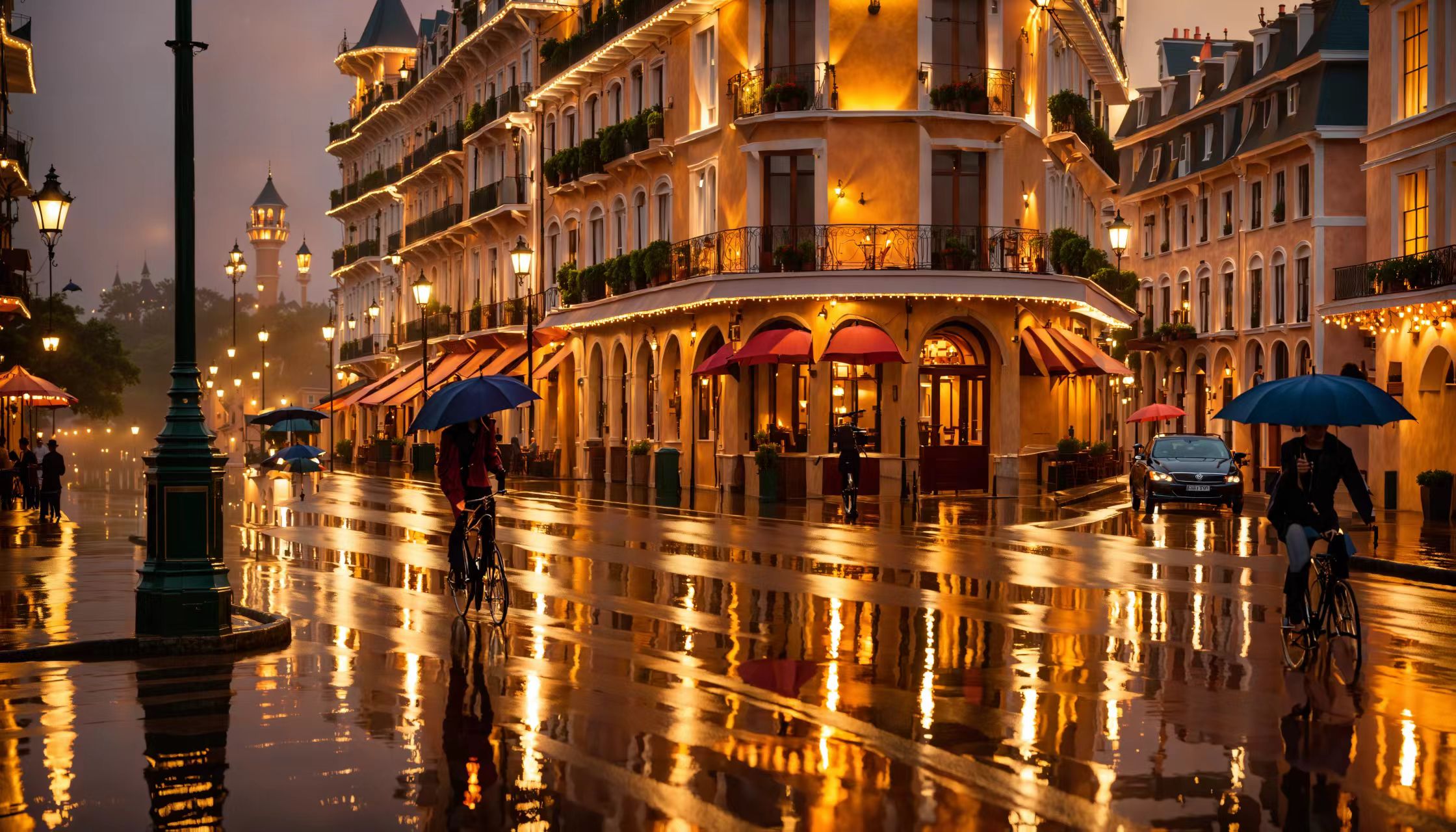 Rainy, Afternoon, Golden Hour, Cityscape, Tower Reflections, Wet Asphalt Roads, Reflecting Lights And Car Trails, Umbrellas, Bicycle Shelves, Street Art, Dusk Glow, Rustic Buildings On Opposite Bank, Fog Rolling Over Water, Cruise Ship Sounds, Coffee Shop Fragrance, Tranquility, Comfortable, Soothing, Peaceful, Warmth, cinematic lighting, depth of field, high fidelity, texture details, ray traced shadows, global illumination, photorealistic, raw photo style, film grain