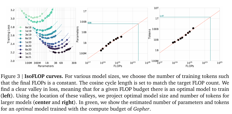 DeepMind 团队通过训练 400 多个模型(参数量从 7000 万到 160 亿,数据量从 50 亿到 5000 亿 Token),重新研究了模型大小与训练数据量的权衡。他们发现目前的许多大模型都严重训练不足(Undertrained)。对于计算最优的训练,模型大小和训练 Token 数量应该以相等的比例进行扩展。也就是说,每当模型大小翻倍时,训练数据量也应该翻倍。【注意,这同kaplan等人提出的“计算预算增加 10 倍时,模型大小应增加 5.5 倍,而训练数据量(Token 数)仅需增加 1.8 倍 ”的结论不同】