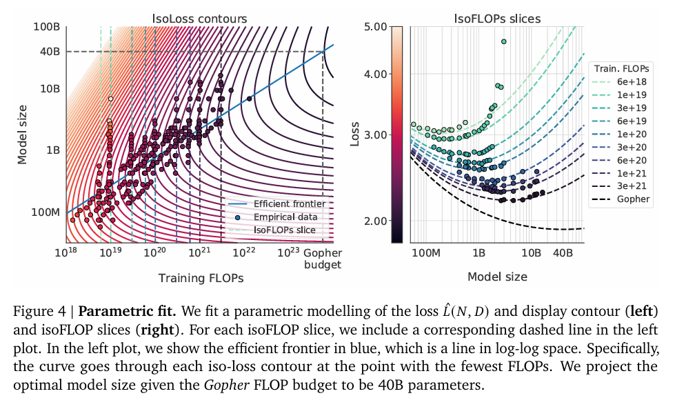 固定模型大小,变化训练序列长度 (与kaplan等人不同的是,针对每一次训练运行,都调整了学习率的 Cosine 衰减周期,使其与计划的训练 Token 数相匹配),得到给定计算量下的的最低损失,对于任意给定的计算预算C,找出能达到最低 Loss 的模型大小N和数据量D,并通过拟合幂律公式。使用IsoFLOP轮廓,选定了 9 个固定的计算预算训练了多种不同大小的模型(对于特定的预算,当模型变大时,