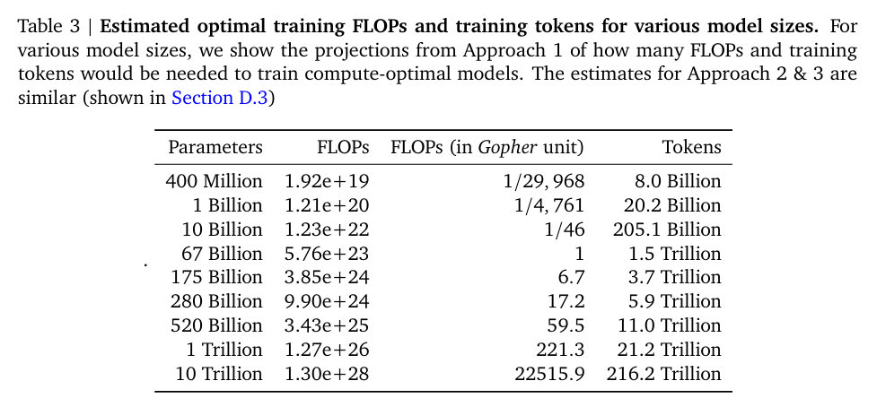 得到了与Kaplan等人不同的结论,即为了保持计算最优,模型参数量和训练 Token 数量应该以大致相等的比例增长(Kaplan等人此前的结论导致人们过分追求大参数量而忽略了数据量),进一步得到了此前几个大模型应该具有的最优大小以及需要使用的数据量大小,特定参数模型对应的最优预训练预算以及需要的tokens数在下面
