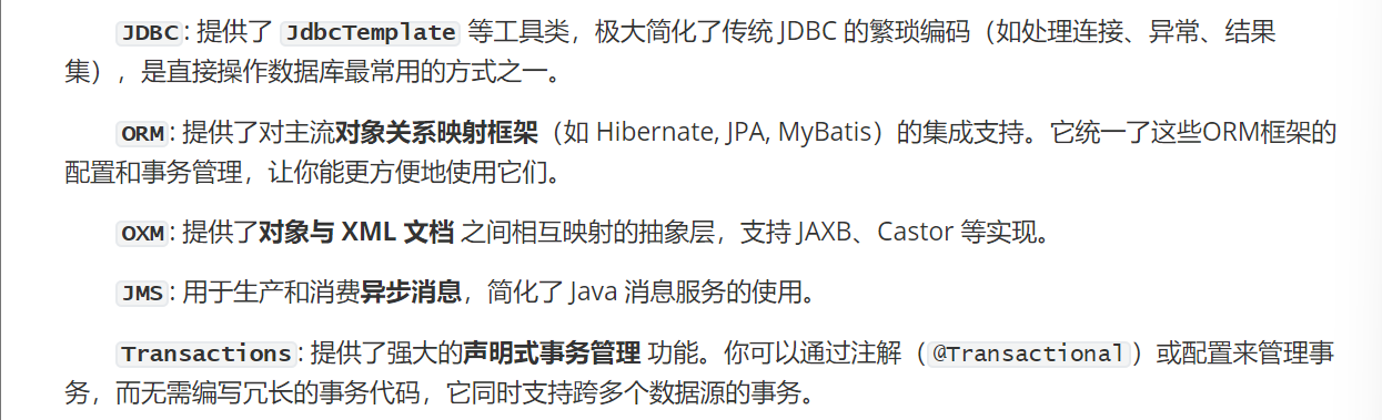 JDBC/ORM用于数据库,JMS用于消息队列,Transactions确保数据操作的原子性和一致性。